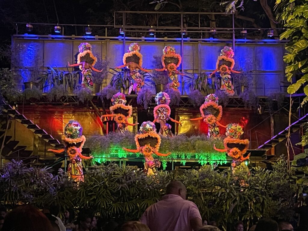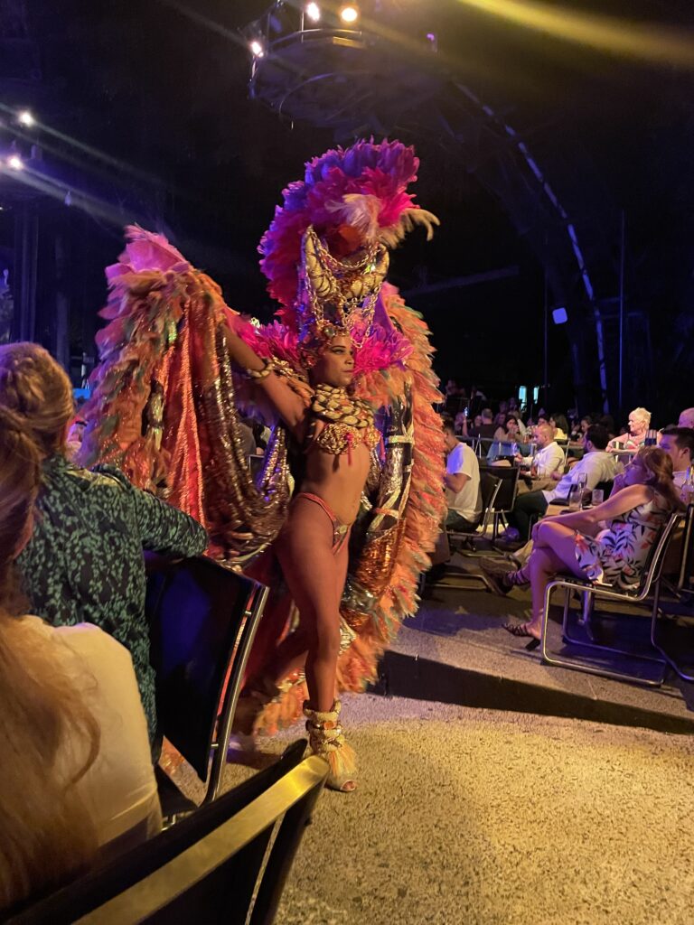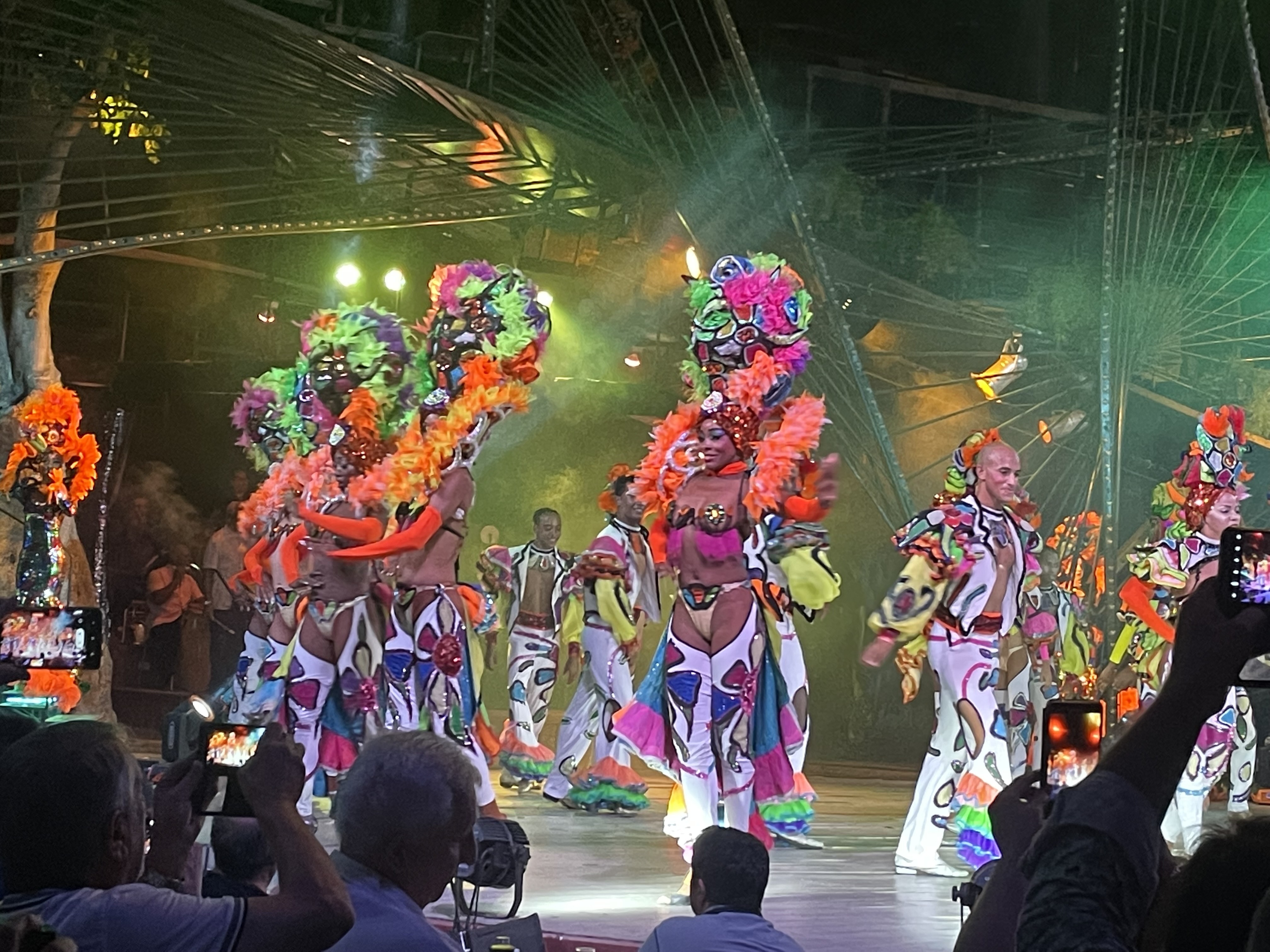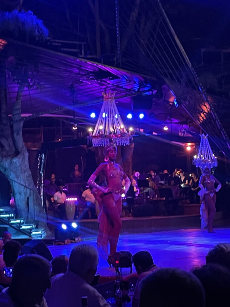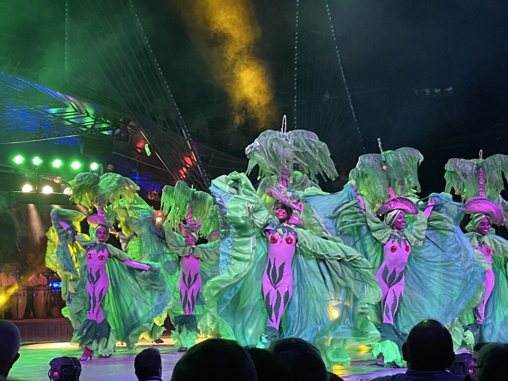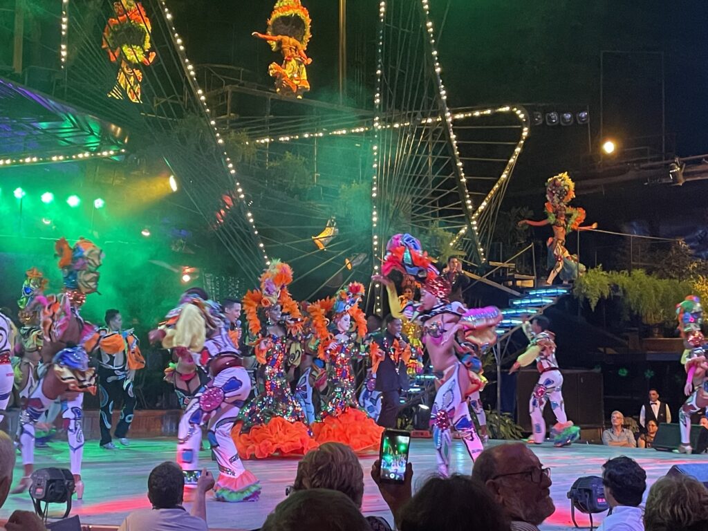 その衣装の凄さ、とりあえず派手なのであります。なんとオープニングからあたまに赤とシルバーのサボテンのようなものが乗っていたし、他にもヤシの木が頭から生えていたり、極めつけにはシャンデリアが頭に乗っているものがありました。ショーと歌にもおそらく歴史的な意味があるように見えます。キューバ現地民とスペインから征服者と思われる衣装でのアクロバティックダンスは素晴らしかった。こっちも乗せられて体が揺れてしまいます。
