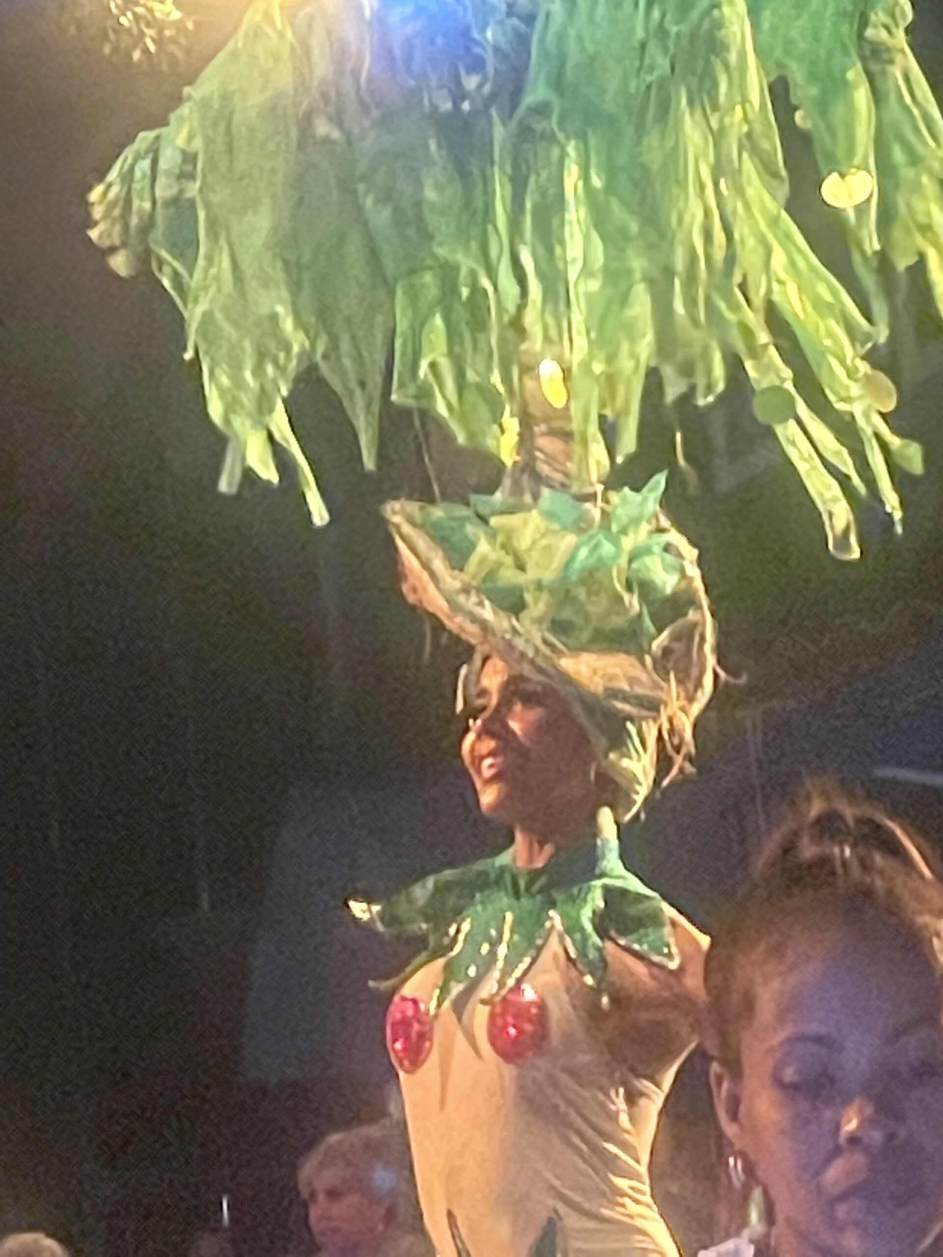 その衣装の凄さ、とりあえず派手なのであります。なんとオープニングからあたまに赤とシルバーのサボテンのようなものが乗っていたし、他にもヤシの木が頭から生えていたり、極めつけにはシャンデリアが頭に乗っているものがありました。ショーと歌にもおそらく歴史的な意味があるように見えます。キューバ現地民とスペインから征服者と思われる衣装でのアクロバティックダンスは素晴らしかった。こっちも乗せられて体が揺れてしまいます。
